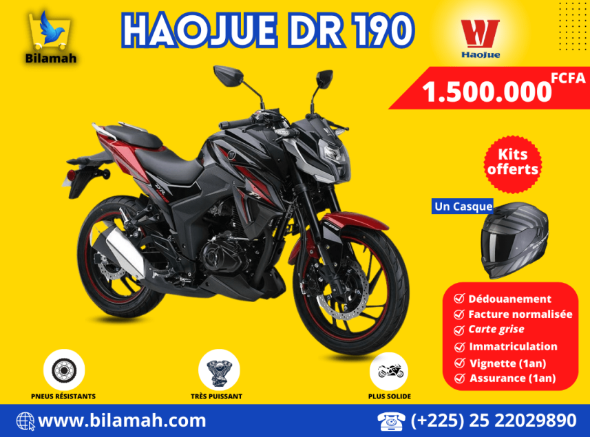 La DR190S est une superbe et robuste moto alimentée par un moteur à injection de type mono-cylindre, refroidi par air, quatre temps avec une puissance maximale de 11KW. Elle dispose de 5 vitesses et peut fonctionner à 105 Km/h voire 120 km/h. Pour un réservoir d’une contenance de 12Litres de carburant, sa consommation est de 2,1L d’essence pour 100Km de distance parcourue.