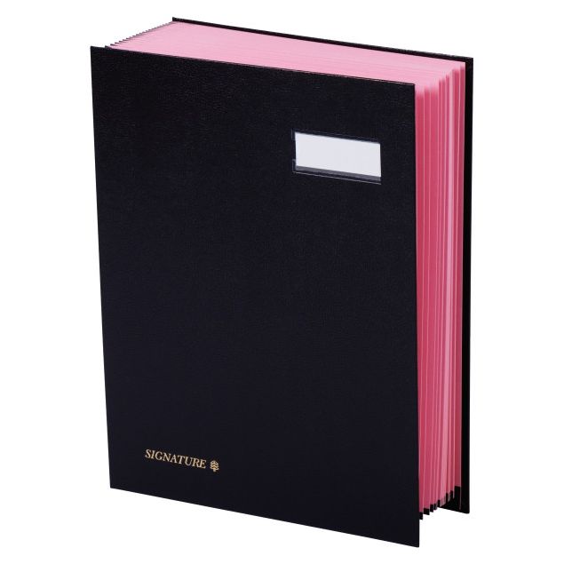 Parapheur secrétariat 24 compartiments noir. Couverture rigide plastifiée grainée. Porte étiquette + étiquette. Compartiments en buvard rose perforés pour déceler la présence de documents à l’intérieur. Onglets encochés et renforcés. Dos extensible renforcé. Format 24x32 cm pour classer format A4.