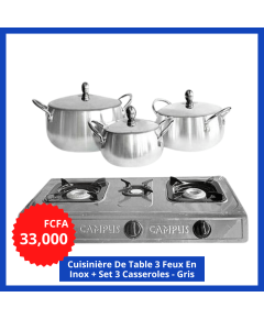 Cuisinière De Table 3 Feux En Inox + Set 3 Casseroles - Gris Détails Doté d'une performance exceptionnelle,‎ cet appareil ajoute un plus au décor de votre cuisine grâce à son design bien pensé et sophistiqué.‎ ‎Cette finition en acier inoxydable est revêtue d‎‎e verre pour plus d'hygiène...