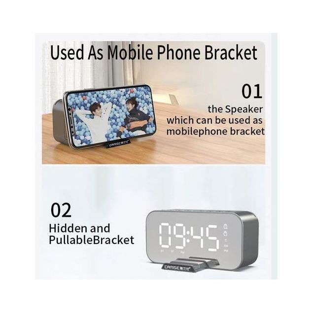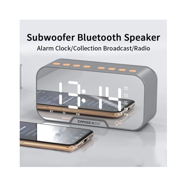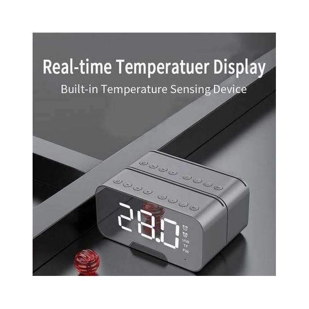 SPÉCIFICATIONS : Haut-Parleur Bluetooth - Radio FM - Réveil - Gris Version Bluetooth: 5.0 Puissance de sortie: 3 W THD = 10% Réponse en fréquence: 80 HZ-20 KHZ SNR: ≥65dB Fréquence radio: 87,5 MHZ-108 MHZ Plage de température: 30 ° c-50 ° c Haut-parleur: : 40Ω / 3W Gradateur d'affichage: 3 niveaux Poids de l'article: 0. 32 kg Batterie. 3. batterie au lithium 7V 1400mAh Taille L x P x H: 131 * 46 * 69 mm Batterie rechargeable intégrée: 3. batterie au lithium 7V 1400mAh Temps de jeu: environ 3-6 heures Temps de charge: environ 3-4 heures Veille: environ 200 heures Contenu de l'emballage 1 x Haut-parleur1 x Manuel de l'utilisateur1 x Câble de chargement micro USB REMARQUES 1. Veuillez LIRE attentivement le manuel de l'utilisateur avant d'utiliser ce produit et le conserver pour référence ultérieure.2. Veuillez essuyer doucement l'écran LED avec un chiffon pour objectif pour éviter de rayer la surface.3.Connexion: Bluetooth, carte Micro SD jusqu'à 16G, câble auxiliaire de 3,5 lignes. 87,5-108 MHz.4.Batterie rechargeable intégrée, cet appareil peut être chargé à partir d'un adaptateur de téléphone portable ou d'un ordinateur. Lorsque le haut-parleur indique que la batterie est faible, veuillez charger le haut-parleur. Si vous ne l'utilisez pas, veuillez l'éteindre. Si vous ne l'utilisez pas pendant une longue période, veuillez le charger dans les 2-3 mois pour protéger la batterie.5. Lorsque le haut-parleur est défectueux, veuillez insérer et appuyer sur le bouton "RESET" intégré à la prise AUX, utiliser des outils comme redresser le clip. En mode horloge, la température est affichée toutes les 10 secondes. Réglage du réveil 2 Comme support de téléphone Permet la musique Bluetooth, l'indicateur de lecture de musique de la carte TF et l'indicateur de lecture de la radio FM.Les appareils peuvent être chargés à partir d'un adaptateur de téléphone portable ou d'un ordinateur.
