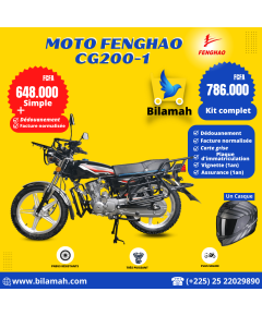 MOTO FENGHAO CG200-1 Info de Base. N° de Modèle. CG125 mode de freinage Avant et arrière Hub Méthode de refroidissement Refroidissement par air Gamme Année Après 2010 État Nouveau Marque Déposée FENGHAO Origine Guangzhou Capacité de Production 8000