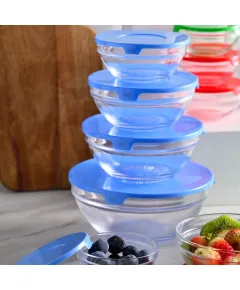 Bols de conservation des aliments et bien d'autres produits. Un ensemble de 5 bols en verre cassable et des fermetures en caoutchouc bien solide . Couleur selon la disponibilité