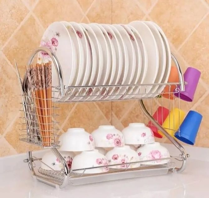 Étagère de rangement d'assiettes, soupières, ustensiles et autres.
