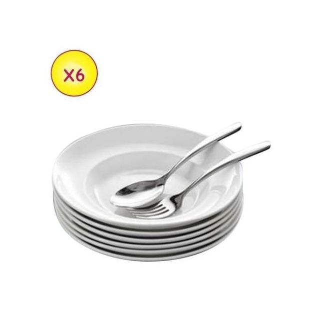 Lot De 6 Assiettes Creuses En Porcelaine + 6 Cuillères Et Fourchettes - Blanc