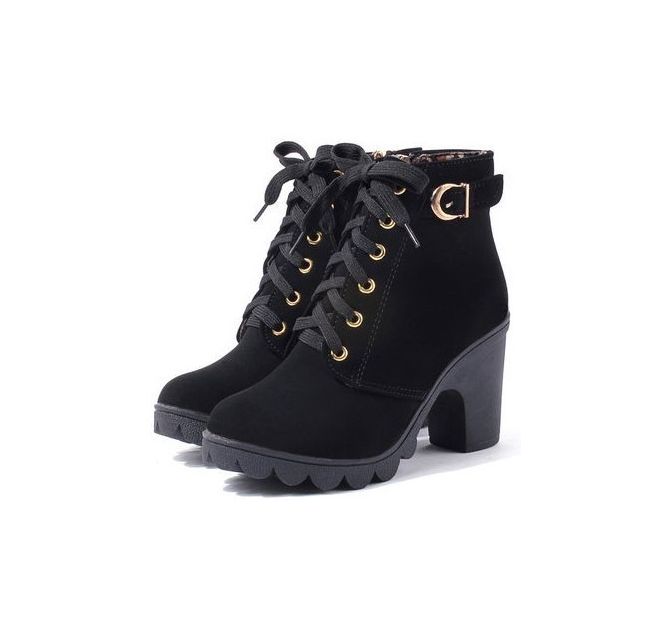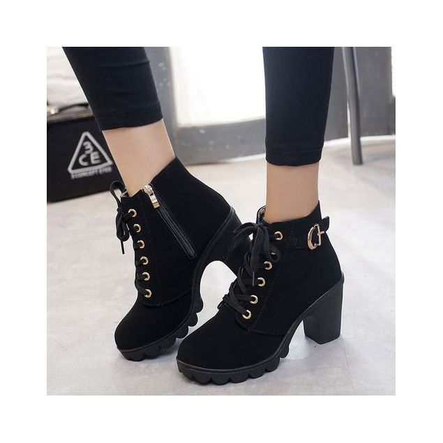 Bottes en cuir à talons hauts pour femme, chaussures à plateforme avec boucle, à lacets, à la mode - Noir