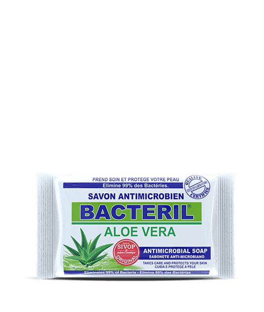 BACTERIL à l’Aloe Vera est un savon de toilette antimicrobien qui lutte efficacement contre les parasites de la peau, points noirs, boutons, acnés, eczémas.