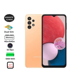 Samsung Galaxy A13 - 6.5" - 4G - Dual Sim - 50Mpx - 4Go - 64Go – 5000mAh – Orange - Détails   Galaxy A13   Le Samsung Galaxy A13 5G  est un modèle entrée de gamme qui embarque un SoC Mediatek Dimensity 700 5G couplé à 4 Go de RAM et 64 Go de...