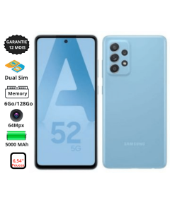 Samsung Galaxy A52 – 6.64" - 5G - Dual Sim - 64Mpx - 6Go – 128Go - 5000mAh – Bleu Détails Le smartphone dont vous avez toujours rêvez         Il mesure 5.00x74.7x8.1 mm et pèse 190 g. Il dispose d'un écran AMOLED de 6.46" pouces....