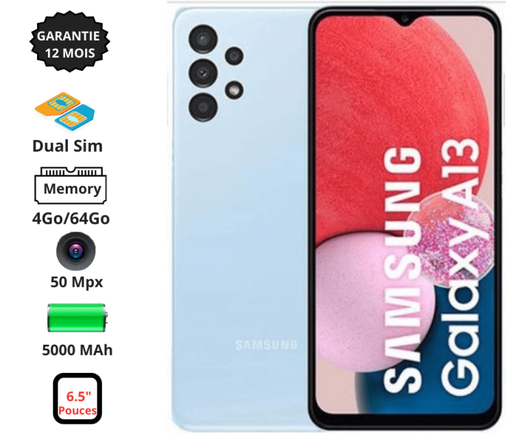 Samsung Galaxy A13 - 6.5" - 4G - Dual Sim - 50Mpx - 4Go - 64Go – 5000mAh – Bleu