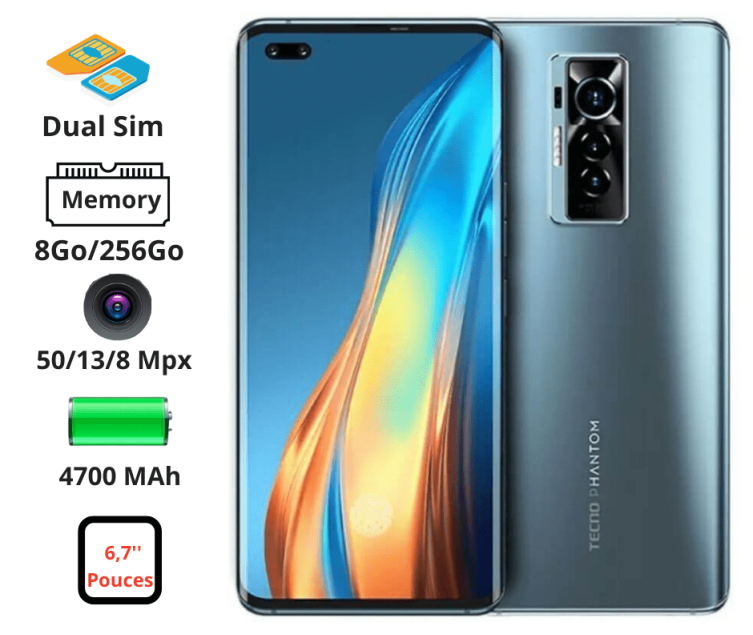 Tecno Phantom X- 4G - 6.7" - 8/256 Go - Triple Camera 50/13/8 MPx- Emprunte Sur L'ecran - Bleu