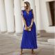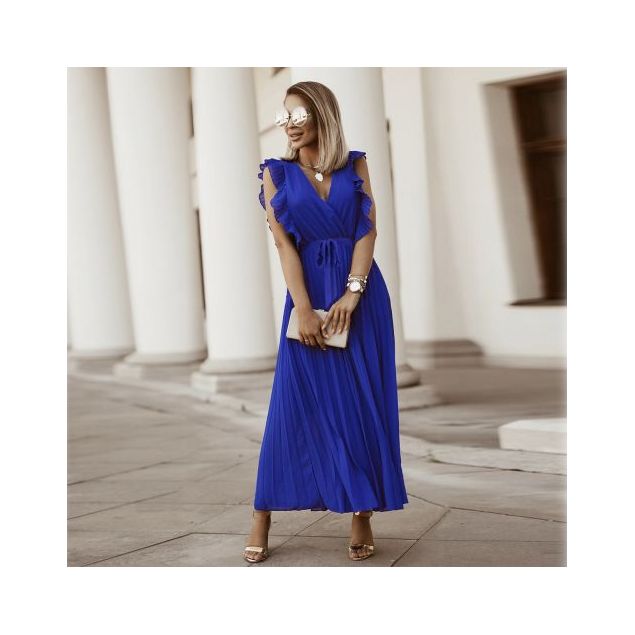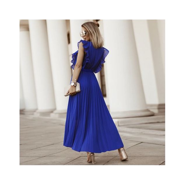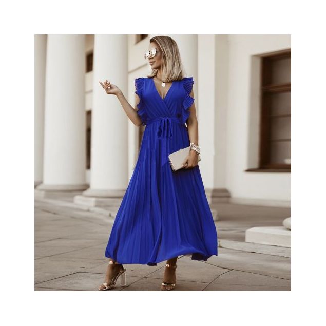 Robe longue plissée en mousseline de soie pour femme, tenue de soirée, col en V, couleur unie, sans manches, élégante Bleu