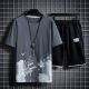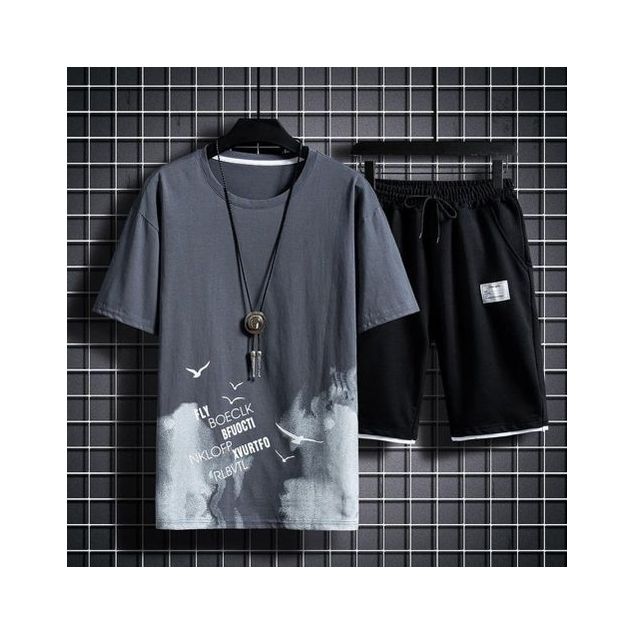 Ensemble 2 pièces pour hommes, T-shirt imprimé décontracté, short, survêtement, mode homme, vêtements de sport Gris / Noir