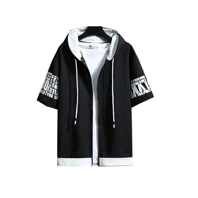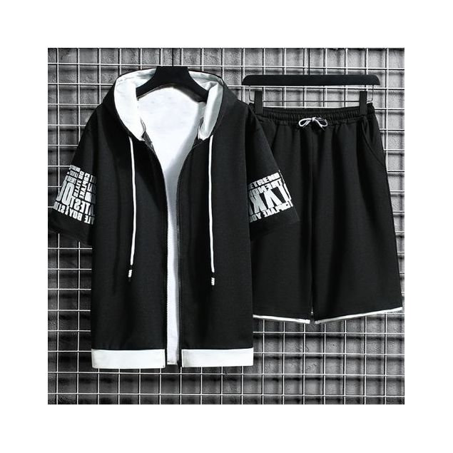 Hommes deux pièces mode à capuche à manches courtes Fitness sport costume décontracté respirant vêtements de sport à manches courtes pull + Shorts*Comprend une veste à manches courtes, un short (hors T-shirt à manches courtes)Lieu d'origine : CN (Origine)Col: Capuche ; Type de boucle : cordon de serrage ; Type de fermeture : Aucun ; Matériel : Polyester Masculin ; Style décontracté, style tendance ; Matériau de composition : polyester ; décoration : chapeau ; Type de motif : couleur unie. Saison: Été ; Style: Combinaison décontractée Athleisure ; Attributs applicables : Sports et loisirs Tissu confortable, lavable et grand teint Scénarios applicables: course à pied, équipement de fitness, beauté du fitness, tendances sportives le noir