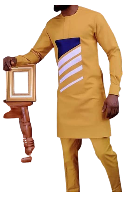 Ensemble Tunique Homme Manches Longue de couleur jaune /Noir- Fait en coton glacé et sans broderie extraordinaire- Propre et pratique pour vos différentes prestations- Disponible en taille L et XL