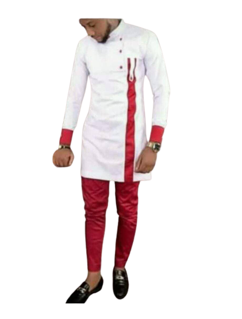 . Ensemble Tunique Homme Manche Longue de couleur rouge /blanc. Fait en coton glacé sans broderie extraordinaire . Disponible en taille L et XL . Propre et pratique pour vos différentes prestations