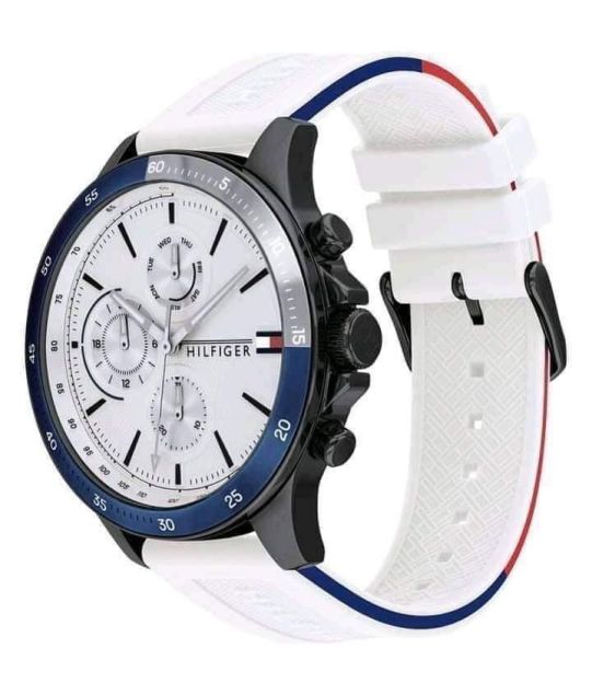 Caractéristique principale:- 100% neuf avec étiquette et de haute qualité ;- Résistant à l'eau 3ATM/30M (ne prend pas en charge la douche, la natation et la plongée);- Affichage du jour et chronographe minutes/secondes (trois sous-cadrans de travail) ;- Boîtier en alliage de zinc de qualité ;- Bracelet de montre en silicone de qualité ; Spécification (approximative):- Diamètre du boîtier : 47 mm- Épaisseur du boîtier : 13,7 mm- Largeur de bande : 24 mm- Longueur totale : 245 mm- Poids net : 100g Emballage inclus:- 1 x montre Tommy Hilfiger - 1 x boîte Tommy Hilfiger