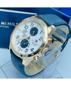 DETAILS Mouvement multifonction Épaisseur du boîtier 10.5 mm / Diamètre du boîtier 44 mm Cadran Blanc semi-brillant Bracelet en cuir  Bleu Résistance à l'eau 5 ATM Peut être portée sous la douche ou lors de la nage, mais pas lors de plongée sous-marine...