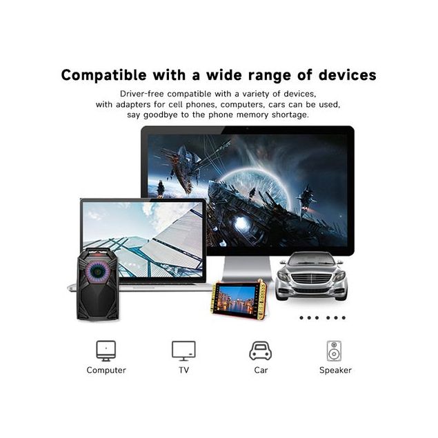 caractéristique:-Petite taille, facile à transporter- Compatible USB 1.1 / 2.0- Compatible avec PC, ordinateur portable, MAC- Stockez vos images, vidéos, chansons et données diverses. -Prend en charge Windows 7/8, Windows Vista, Windows 2000, Mac OS X, Linux.- Facile à lire et à jouer à grande vitesse, aucun lecteur/alimentation requis, il suffit de brancher.