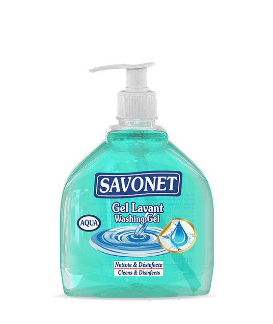 Le gel lavant SAVONET au parfum Aqua nettoie et désinfecte les mains. Il laisse un léger film protecteur et enveloppe délicatement les mains d'un parfum frais aquatique.