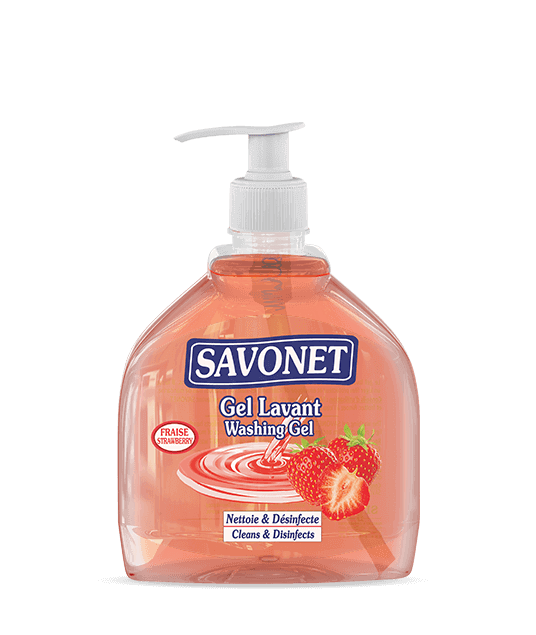 Le gel lavant SAVONET parfumé à la fraise nettoie et désinfecte les mains. Il laisse un léger film protecteur et enveloppe délicatement les mains d'un parfum frais de fraise.