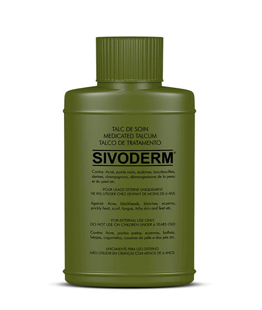 Le talc de soin SIVODERM rafraîchit votre peau et vous aide à lutter contre l'acné, les points noirs, l'eczéma, les bourbouilles, les dartres, les champignons, les démangeaisons de la peau et du pied.