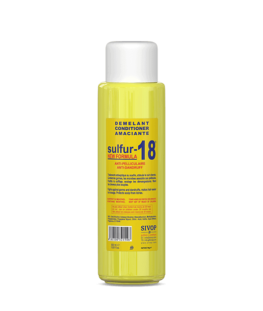Traitement antiseptique au soufre, le démêlant SULFUR-18 (nouvelle formule anti-pelliculaire) stimule le cuir chevelu. Il combat les germes, les microbes associés aux pellicules. Facilite le coiffage, soulage les démangeaisons et rend les cheveux plus souples .