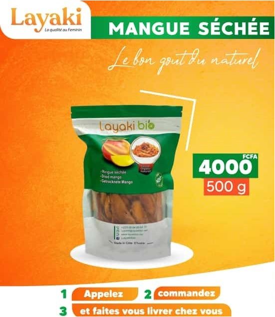 Vous voulez du goût, de la qualité? choisissez les mangues séchées LAYAKI BIO. Les produits sont conçus avec le plus grand soin dans le respect des normes de qualité sanitaire et nutritionnelle pour vous offrir le meilleur. En plus de leur goût somptueux, nos mangues séchées sont riches en vitamines A et C, très chargées en antioxydants, ce qui leur donne un effet préventif contre le cancer. Aussi leur richesse en fibres les rend une véritable aide à la digestion. Les mangues sont naturelles, sans additifs, sans sucre ajouté, sans conservateurs. Achetez vos mangues séchées et passez de très bons moments en famille ou au travail.