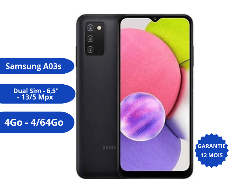 Samsung A03s - 4G - Dual Sim - 6,5" - 4/64Go - 13/5 Mpx - Garantie 24 Mois - Noir