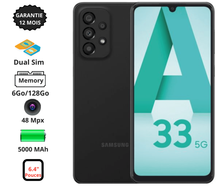- le Samsung galaxy A33 est un modèle de milieu de gamme équipé d'un écran super AMOLED de 6.4 pouces avec un taux de rafraichissement de 90 h z, animé par un SoC SAMSUNG Exynos 1280 (compatible 5G) coupé a 8GB ram et 128GB stockage.
