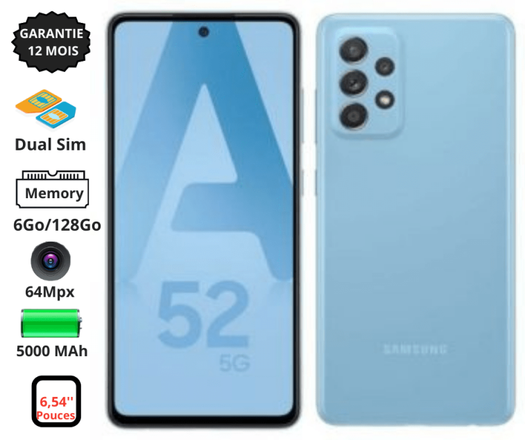 Samsung Galaxy A52 – 6.64" - 5G - Dual Sim - 64Mpx - 6Go – 128Go - 5000mAh – Bleu