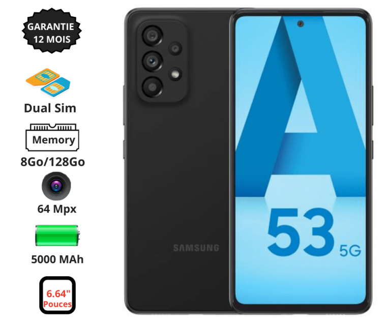 Samsung Galaxy A53 – 6.64" - 5G - Dual Sim - 64Mpx - 8Go – 128Go - 5000mAh – Noir